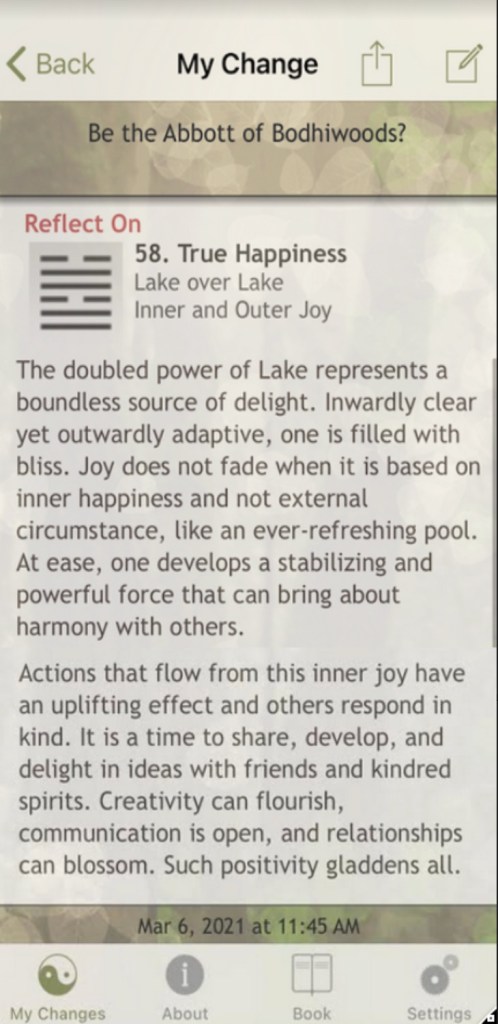 In particular – I loved seeing my original iChing reading that I rolled minutes after Ahjan’s announcement :). No changing lines. Just straight to lake over lake. This has matched my experience these past three years. What a gift.